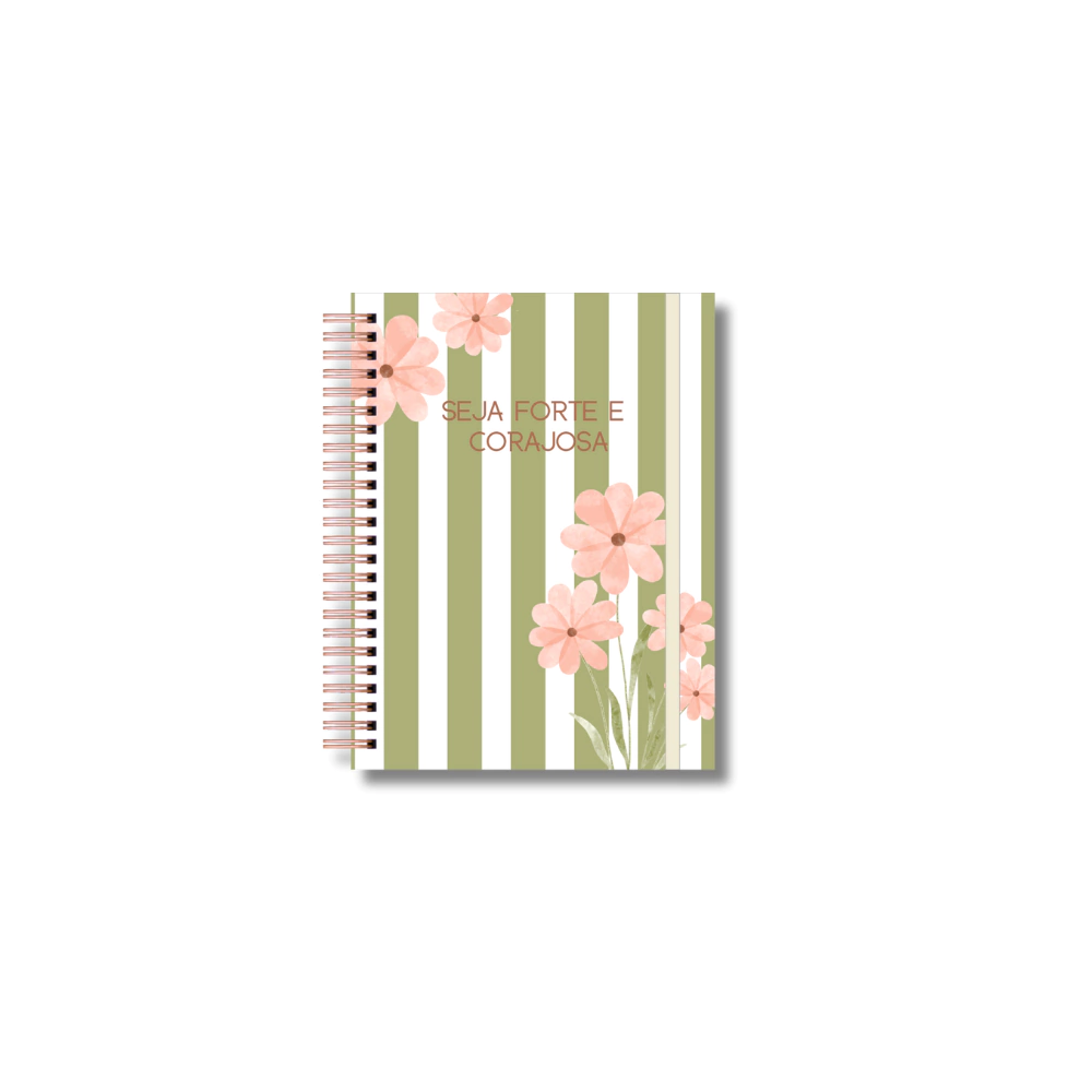 Capa dura formato 150mmx110mm, miolo com 100 folhas em papel offset 90g (folhas mais encorpadas), encadernação wire-o e elástico para fechamento.